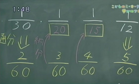 60分の5、10分の1は60分の6となるので、間にあるのはまあ、60分の3と60分の4で。あとこれを、約分していくと、答えが20と15になる」