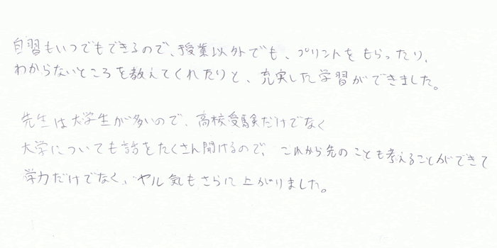 先生は大学生が多いので、高校受験だけでなく、大学についても話をたくさん聞けるので、これから先のことも考えることができて、学力だけでなく、やる気もさらに上がりました。