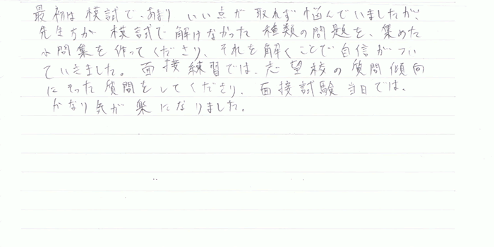 面接練習では、志望校の質問傾向にそった質問をしてくださり、面接試験当日では、かなり気が楽になりました。
